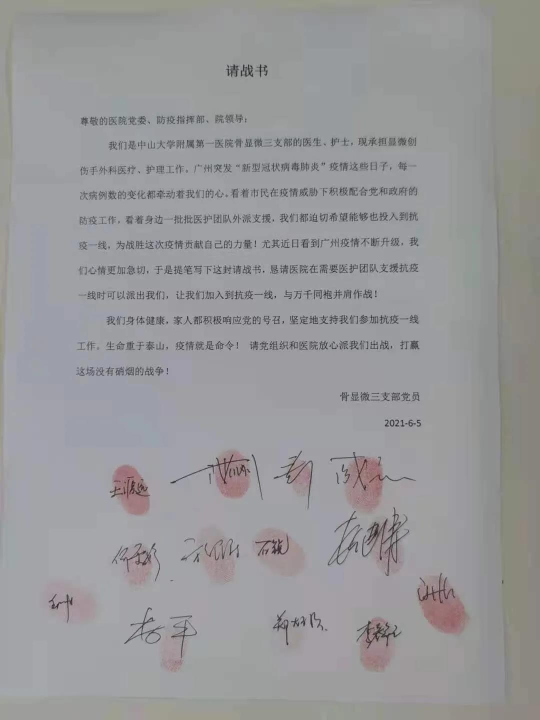 广州抗疫的战斗已经打响,骨显三支部多名党员和科室同事已经战斗在一线,做出了榜样!在向他们致敬的同时,科室也迅速成立了防疫指挥小组,按照医院“五个一”的管控要求,严格落实医院的全面部署,并号召支部全体党员和科室同事,立足本职岗位,在做好自身防护的同时,服从命令,勇于奉献,敢于担当,用行动践行党史学习教育中激发的初心使命,打好广州抗疫这场硬仗,保卫好我们共同的家园!(骨显三支部 王源远、戚剑)