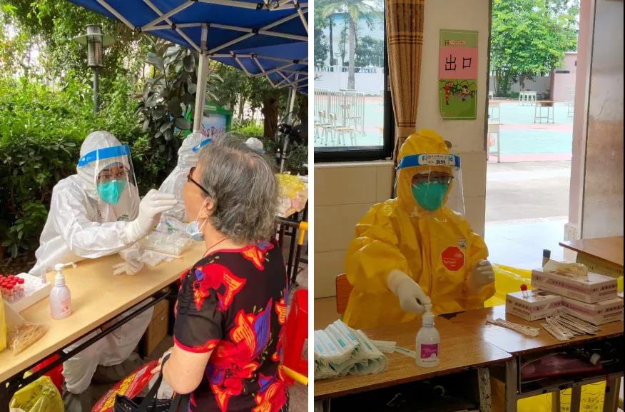 石锐同志是骨显三支部宣传委员,也是医院近期评选的“优秀党务工作者”,这次疫情他第一个冲上前线,自5月30日至6月6日已经连续参加5次外派核酸检测任务,足迹遍布越秀、番禺、荔湾、增城多地。支部党员魏转乐同志6月6日接到医院通知后,立即到岗,支援增城核酸检测工作,工作13小时后的她早已全身汗水,但仍完整、规范地进行脱防护服、手消毒等操作,与新冠病毒斗争,毫不松懈。