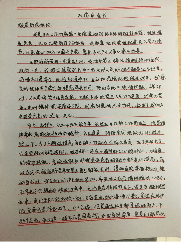 90后的显微创伤手外科护士彭明霞也在第一时间向科室申请前往核酸检测点支援,短短一周已经参与了3场外派核酸检测任务。她在抗疫一线写下了入党申请书。她说:“无论是在骄阳烈日下,或是在狂风骤雨中,我们都不敢放松一刻。”言辞朴实无华而情真意挚。