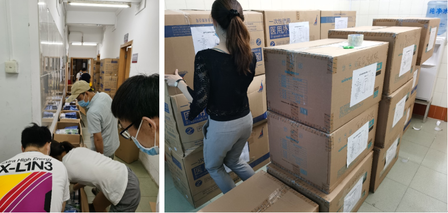 “兵马未至粮草先行”,疫情突然反扑之下,医院后勤工作也开始紧张起来。支部党员王源远同志、学生支部顾凡彬同志,与科室研究生邓佩军、廖法伟、李旭博一起到设备科协助进行物资点数、分装、打包、入库工作,为战斗在抗疫一线的医护人员打造坚实后盾。