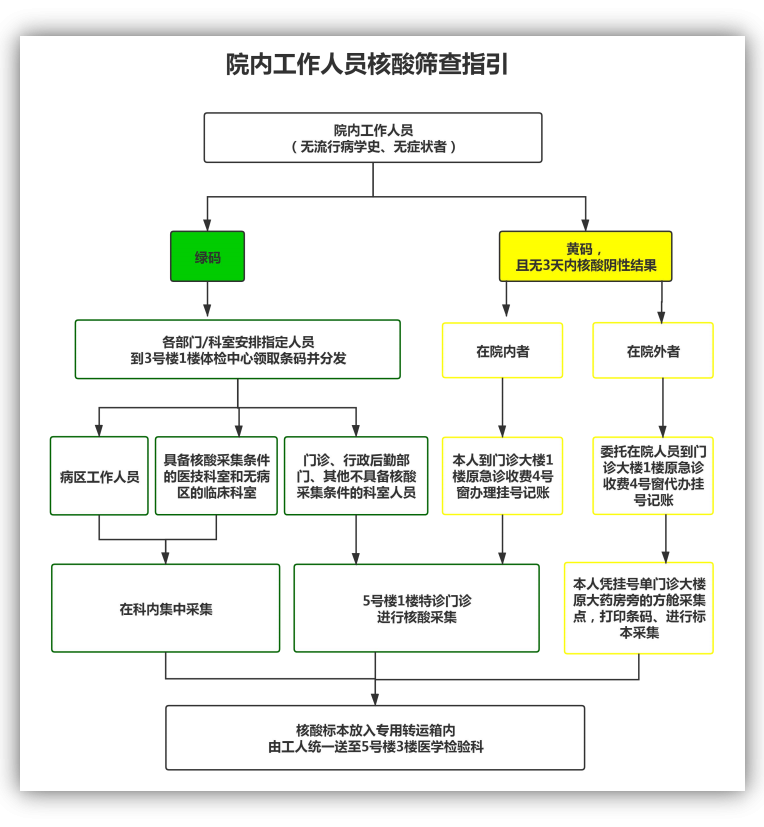 疫情发生后,医务处结合最新政策第一时间制定医院感染预防与控制工作要求,对预检分诊与门诊、发热排查、病房管理、医疗防护、清洁消毒、感控培训、监督检查等七个方面提出严格要求,并创新性制定疫情防控晨会与交接班制度。当职工和患者大量出现“黄码”时,立即建立健全全院职工及患者核酸筛查检测流程,完善了黄码急诊患者诊治全流程,并建立“三人小组”快速处置疫情风险联防联控机制等。截至目前,医务处紧急制定疫情防控各项工作制度和指引17项,严管控、堵漏洞,简流程,为控制疫情提供了强有力的制度支撑。