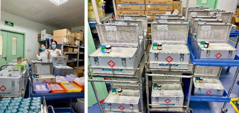 除了医护人员的防护与检验耗材等物资,急救药品保障也是抗疫战斗中不可或缺的一环。6月4日上午九点,药学部接到医院通知,为医疗队配备急救药箱,以便在队员或采样现场群众出现紧急情况时立即施救。收到指示后,周慧与同事马上开始紧张但有序的准备工作。肾上腺素、地塞米松、各类型的输液袋等药品种类繁多,他们细心一一分拣、核对。周慧同志忙到中午也顾不上吃饭,心里想的都是一定要在队员出发前配齐药品保障!